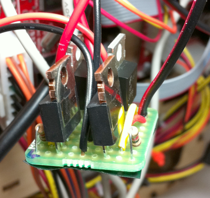 The most commonly used solution seems to be the relay fix by rwensley. This allows the extruder motor to be powered directly from the +12V supply line, avoiding the failure of A3949. But the downside of a relay fix is that PWM is disabled, thus the feed speed cannot be fully controlled. So I started thinking about a MOSFET based fix. The first version is to use a single MOSFET (IRF510) in the place of relay, and this allows the motor to only move forward (which often suffices). The schematic is shown below: