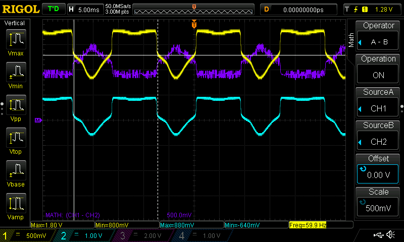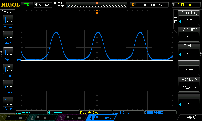 The calculation of gate current above assumes a static measurement, but since the triac is controlling an AC load, the forward-on voltage and gate current are both dynamic. Therefore I decided to take measurements using an oscilloscope to make sure the triac is reliably switched on.