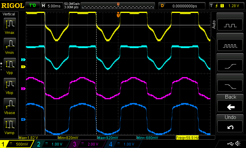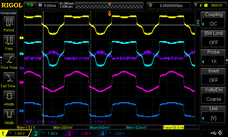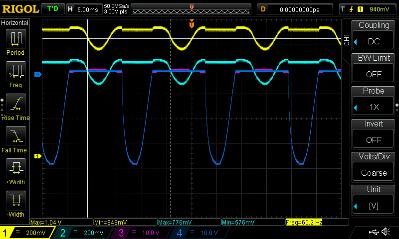 By varying the potentiometer from low to high, I found the point at which the load current starts to miss half of the AC cycles, indicating the triac was still firing in Q1 but failing in Q4. Below are the measurement screenshots. Channels A, B, C, D are displayed in Yellow, Cyan, Purple, and Blue respectively.
