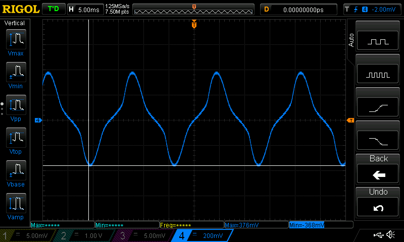 The screenshot below show the direct measurement of . The peak voltage is 0.37 V, corresponding to 260 mA RMS current. This is consistent with the typical holding current of a 24 VAC solenoid.