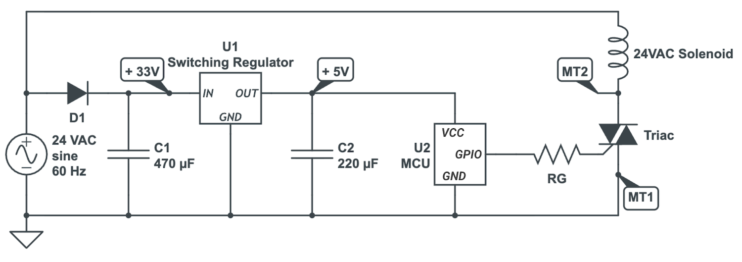 - Half-Wave Rectification: We use a single diode to convert 24 VAC to DC for the logic. This choice is not primarily about cost—it is essential to make a single-supply triac design work. Specifically, half-wave rectification allows the MCU ground and one side of the AC waveform to share a common reference. Full-wave rectifiers, in contrast, create a “virtual ground” that would short-circuit the triac drive path in this topology.