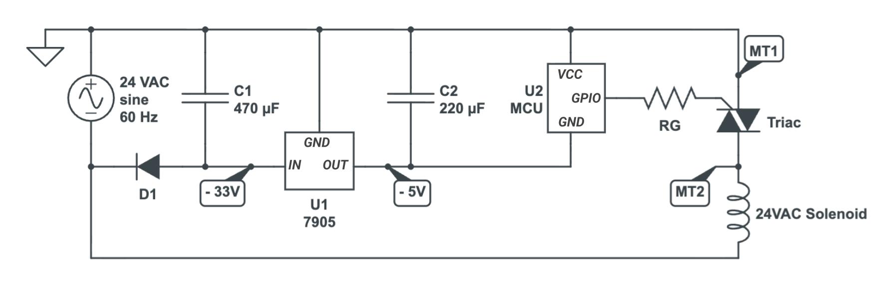 The first step is converting 24 VAC into low-voltage DC (5V or 3.3V) to power the MCU and peripherals. This is done using a half-wave rectifier (single diode) and a bulk capacitor, followed by a step-down voltage regulator.