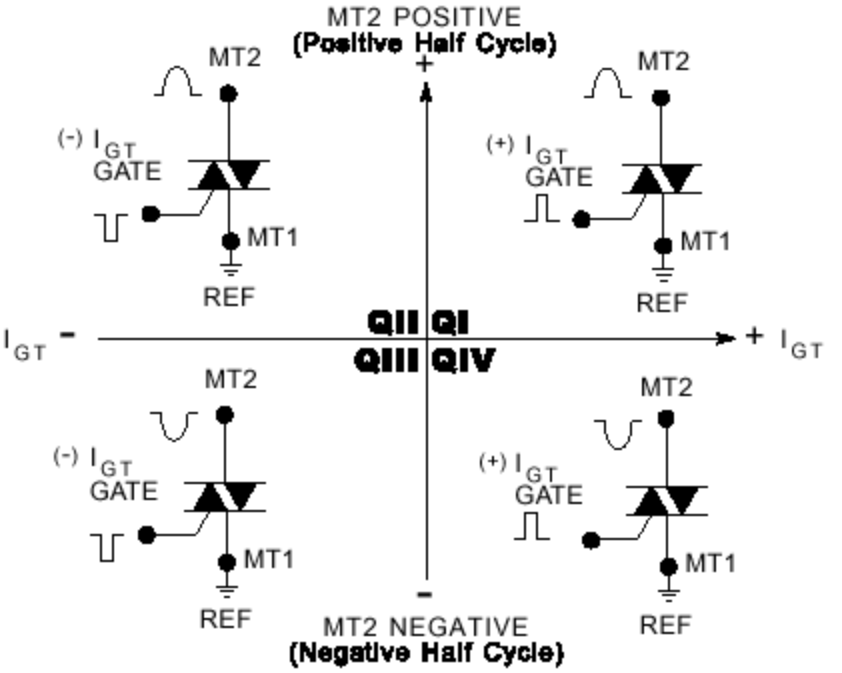 Because a triac controls AC power that swings positive and negative, and the Gate can be triggered by either positive or negative current, there are four distinct operating modes, or Quadrants. These are defined by the polarity of MT2 and the Gate, both measured relative to MT1.