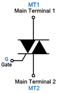 A triac’s three terminals are named Gate, Main Terminal 1 (MT1), and Main Terminal 2 (MT2). These are analogous to Base, Emitter, and Collector of a transistor. Similarly, current flowing between the Gate and MT1 can turn it on, allowing current to flow between MT2 and MT1. However, there are key differences: