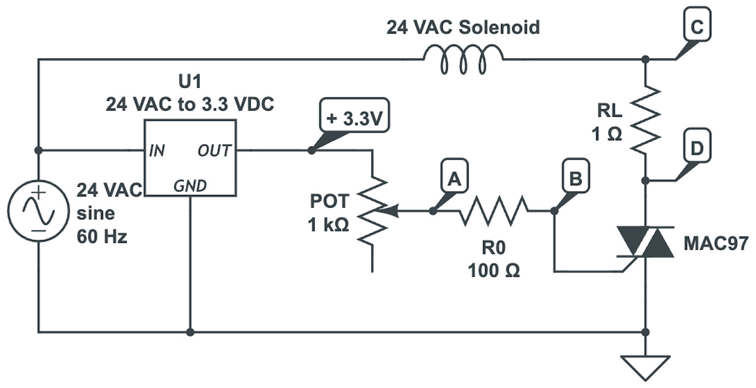 To do so, I made a simple prototype circuit consisting of a 24 VAC to 3.3 VDC switching regulator, a MAC97 Triac, an adjustable gate resistor (100~1100 Ω), a 1 Ω shunt resistor for measuring load current, and a terminal block to hook up a 24 VAC solenoid. Below is a simplified schematic and the actual photo of it.