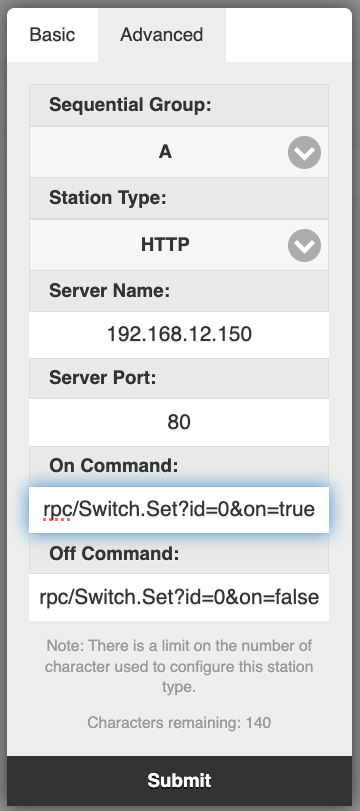 - Configure the HTTP commands. Using the Shelly US plug as an example: