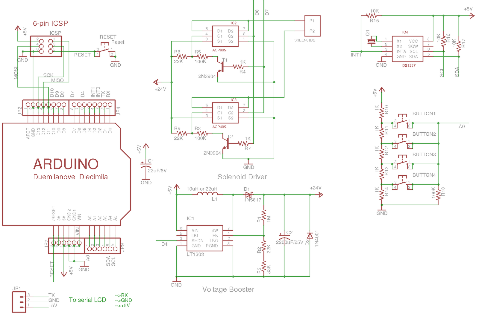 As for sketch code, refer to my previous posts for code to control the valve and read input buttons. To interface with DS1337 RTC, I use this excellent RTC library.
